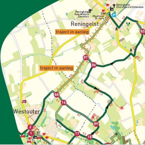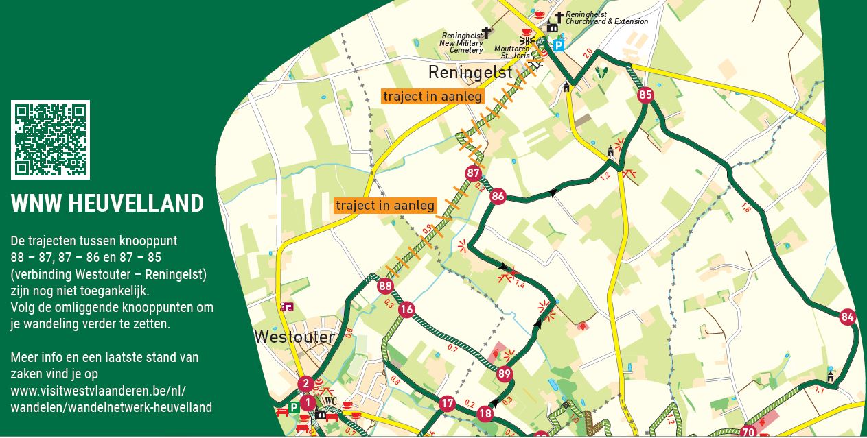 Wanderwegenetzes Hoppeland einerseits und in Richtung Wijtschate, Wulvergem und Mesen und des Wanderwegenetzes