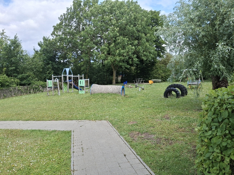 In Kemmel, you will find a playground full of fun and original play opportunities for children of all ages. Ready to climb, crawl, and explore? There are tractor tires to climb on, jump over, or just relax in. A large seesaw, a two-person seesaw, and spring riders. A challenging climbing and scrambling structure and a crawl tunnel - perfect for little adventurers. There is also a swing with a toddler seat. You can test your balance and agility on the stepping poles.