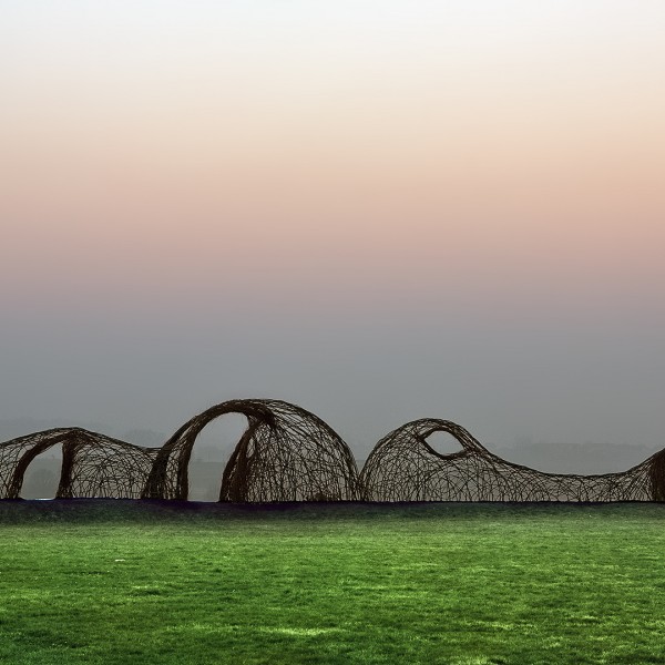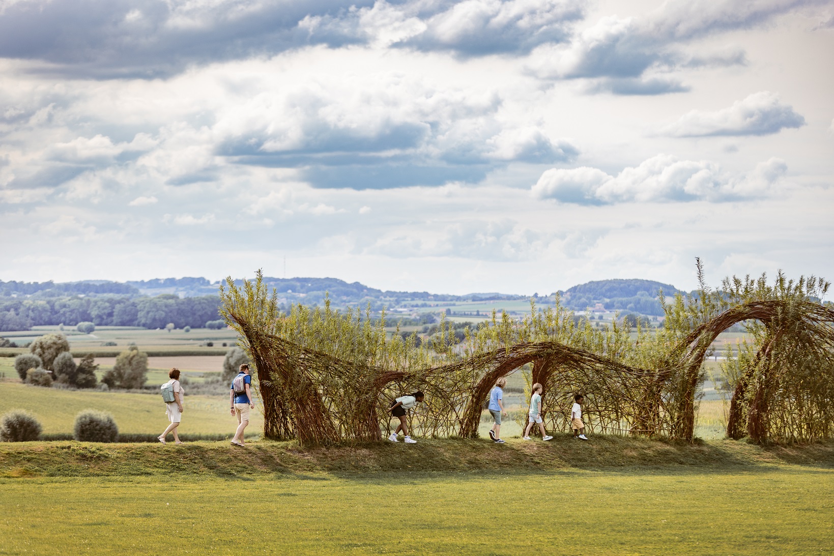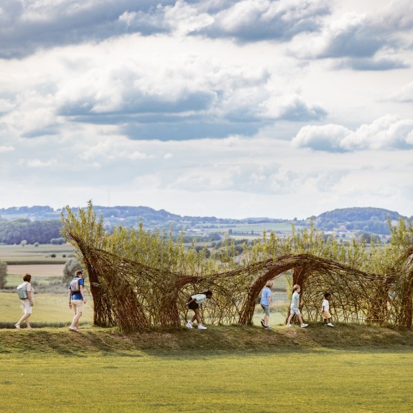 De landart installatie – la courbes des Émotions - is een blikvanger. De ligzetel eronder nodigt je uit om rustig van het landschap te genieten.