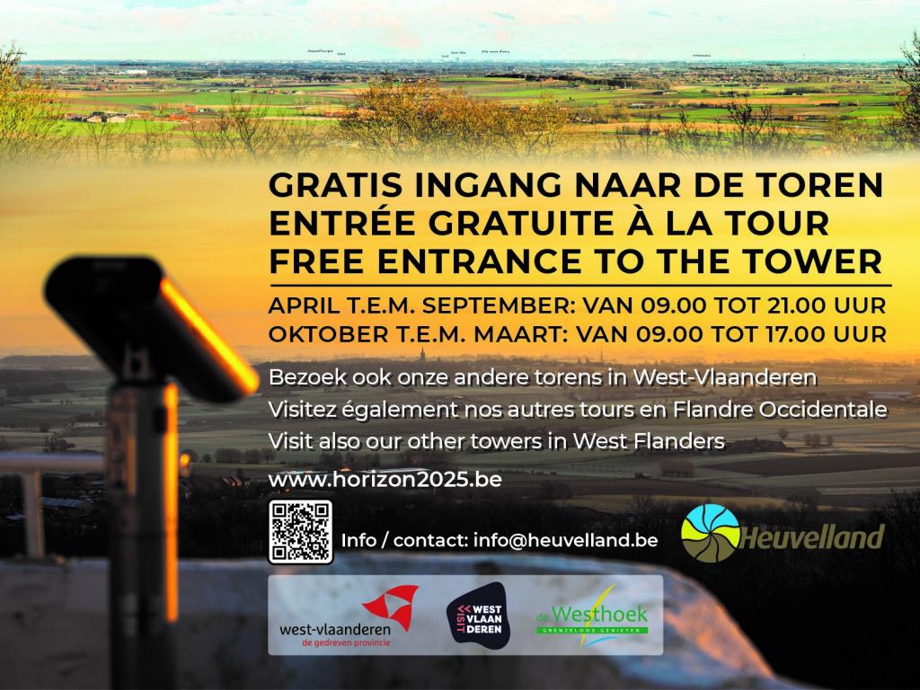 De Belvedèretoren is de blikvanger van de Kemmelberg. Hij kent een bewogen geschiedenis waarover je meer te weten komt tijdens de beklimming van de toren. Boven staan twee panoramaborden met een aanduiding van de belangrijkste bezienswaardigheden. Het uitzicht is er adembenemend: je staat er 170 meter boven de zeespiegel! Je kan er 40 km ver kijken en met de verrekijker zelfs nog verder. Veel plezier op de toren!