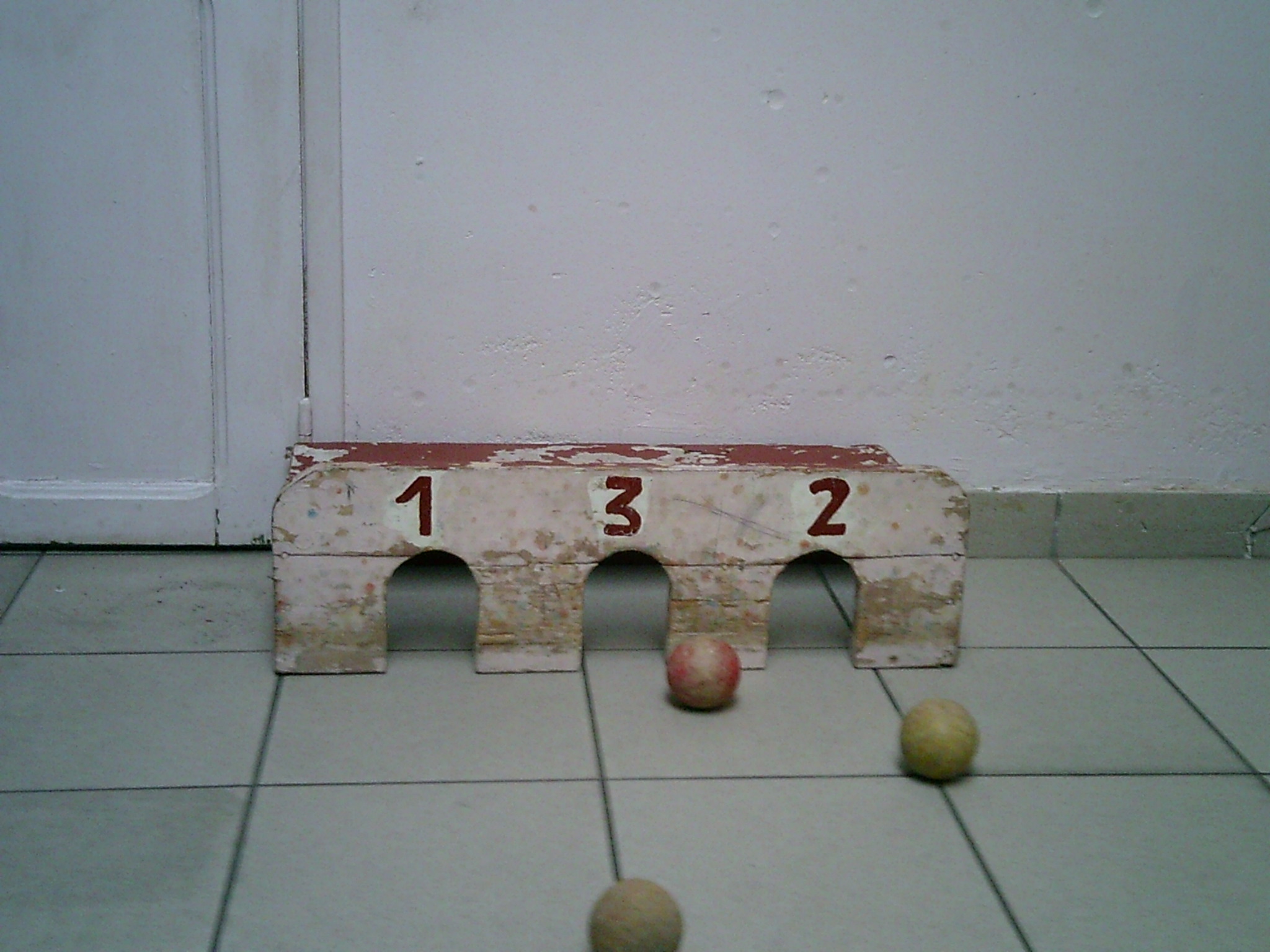 Elke speler gooit een aantal houten bollen naar de poortjes in een bak. Een bol in het middelste vak levert nul punten op.