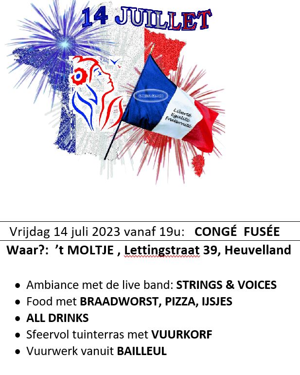Ambiance met de live band: strings & voices Food met braadworst, pizza, ijsjes All drinks Sfeervol tuinterras met vuurkorf Vuurwerk vanuit Bailleul