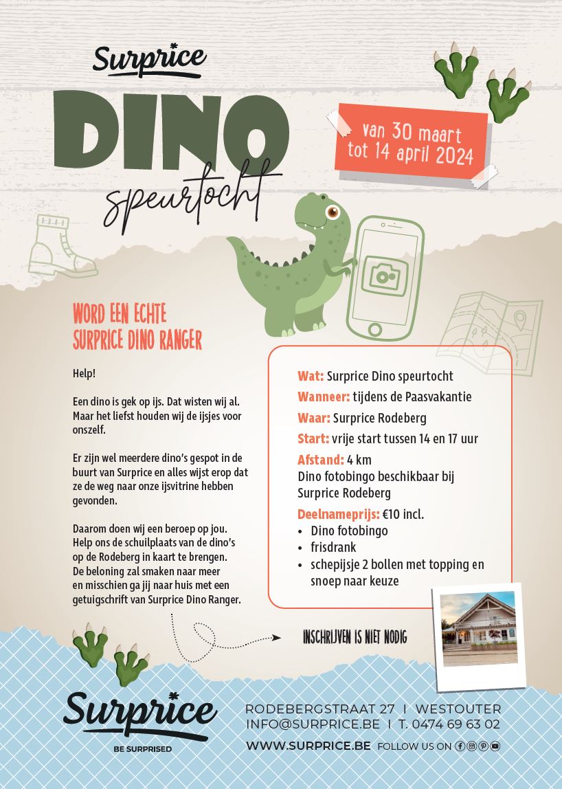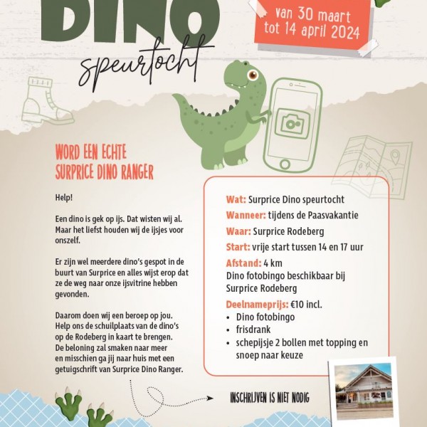 Daarom doen wij een beroep op jou. Help ons de schuilplaats van de dino’s op de Rodeberg in kaart te brengen. De beloning zal smaken naar meer en misschien ga jij naar huis met een getuigschrift van Surprice Dino Ranger.