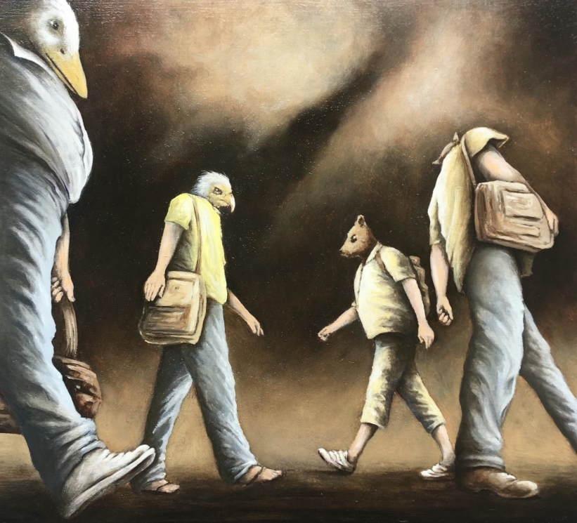 Pieter Lerooij geboren in 1958, studeerde grafische kunsten aan St Lucas Gent. Naast etser is hij ook tekenaar, schilder en recent ook boetseerder. Hoewel in zijn tijdloze antropomorfe werken zelden of nooit menselijke gezichten te zien zijn, slaagt hij er op een indringende manier in een loopje te nemen met ons " mens zijn" . Hij houdt ons tegen en doet ons nadenken. Geen prentjes maar confronterende realiteit, nu eens hard, dan weer met humor. Hij toont ons het vrolijke maar ook het minder vrolijke van ons verankerd denken.