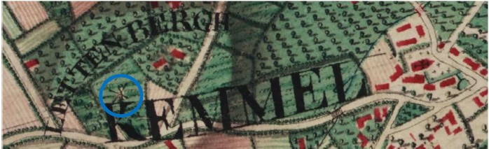 Deze korenmolen werd reeds vermeld op de kaart van Sanderus uit de 17e eeuw, maar ook in een koopakte uit 1598.