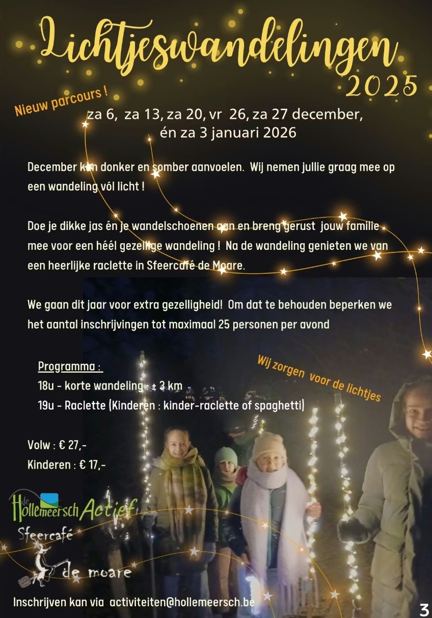 Wij nemen jullie graag mee op pad om licht te brengen in deze duistere dagen ! Kies een vrijdag of zaterdag in december of op 3 januari, trek je dikke jas én je wandelschoenen aan en kom om 18u00 gezellig mee wandelen… ! vernieuwd parcours !