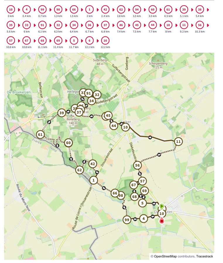 Startpunt: knooppunt 8 – dat vind je aan de parking in de Kasteeldreef Kemmel, de paal met het knooppunt staat net binnen het Warandepark. Maar je moet vervolgens stappen richting knooppunt 6, dat is ‘bergaf’ de Kasteeldreef en dan de straat dwarsen naar knooppunt 6.