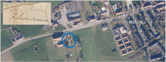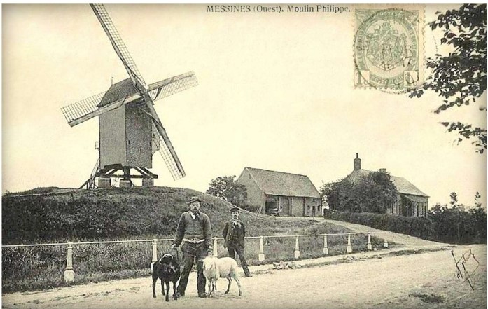 Deze korenwindmolenlag op de weg Mesen-Wulvergem ter hoogte van huidige “Messines Ridge British Cemetery” nabij de “Ferme du Moulin”.
