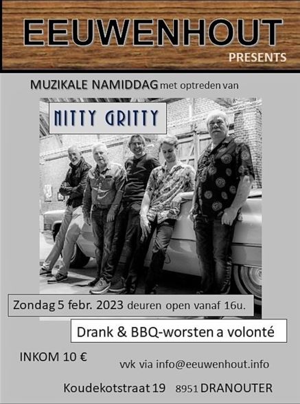 Muzikale namiddag met optreden van Mitty Gritty. Zondag 5 februari 2023 vanaf 16u Locatie: Eeuwenhout, Koudekotstraat 19, 8951 Dranouter Inkom €10 VVK via info@eeuwenhout.infoDatum: Zo 5 februari 2023Prijsinfo: € 10 - Basistarief