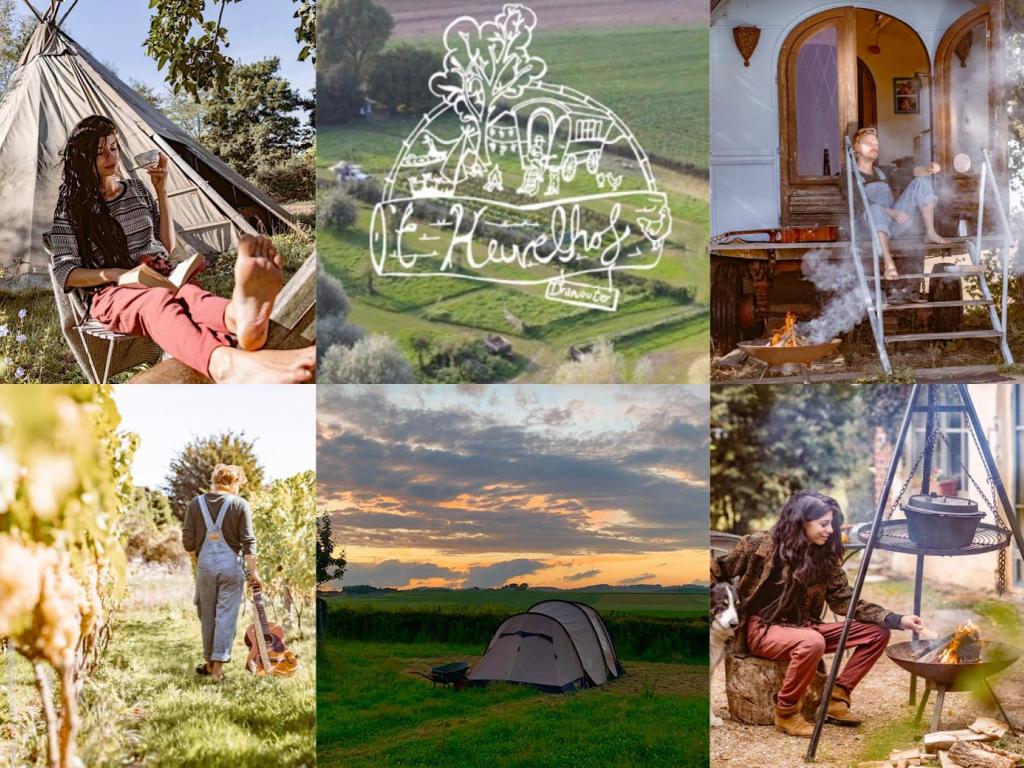 Kom bivakkeren met een tentje of camperbusje op het terrein van 't Heuvelhof. We bieden je verschillende unieke plaatsen aan: ouderwets bivakkeren met je tentje of busje in de landerijen rond de wijngaard of in het bosje. Dit alles alleen, met je vriend(in), gezin of met je (vele) vrienden ... Viervoeters zijn ook welkom!