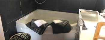 Charmant huisje van 60m2 Woonkamer woonkamer ingerichte keuken en kantoorruimte Badkamer met ligbad 2 slaapkamers één met...