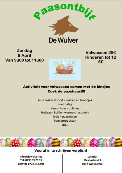 Kom op Paaszondag voor een heerlijk paasontbijt naar Hoeve De Wulver. Geniet met de kinderen van een heerlijk vers ontbijt. Voor de kindjes is er een paaszoektocht op de hoeve bij de diertjes.