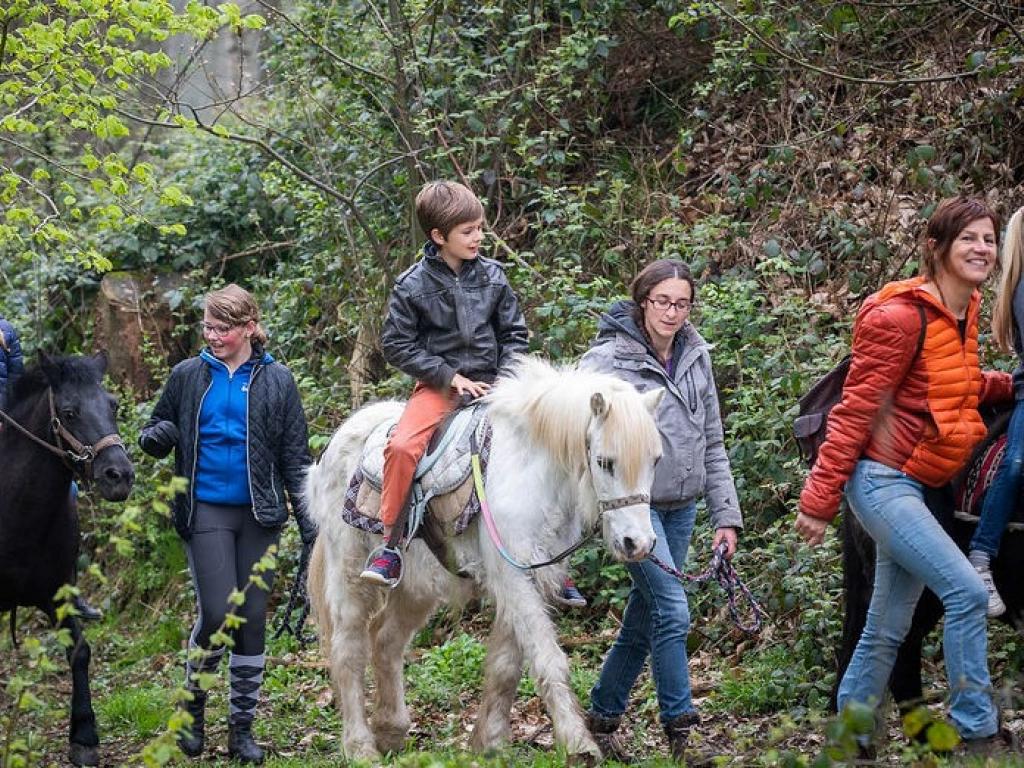 De begeleiders van de kinderen stappen mee en sommigen begeleiden ook een pony, onder leiding van een equisense verantwoordelijke.