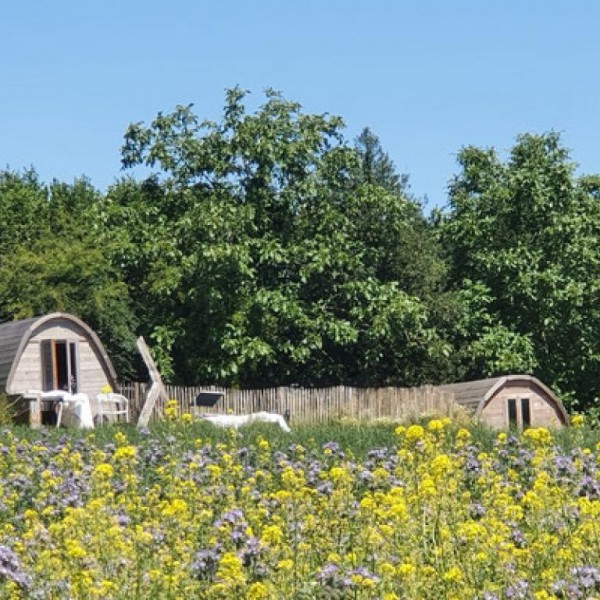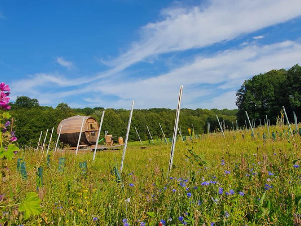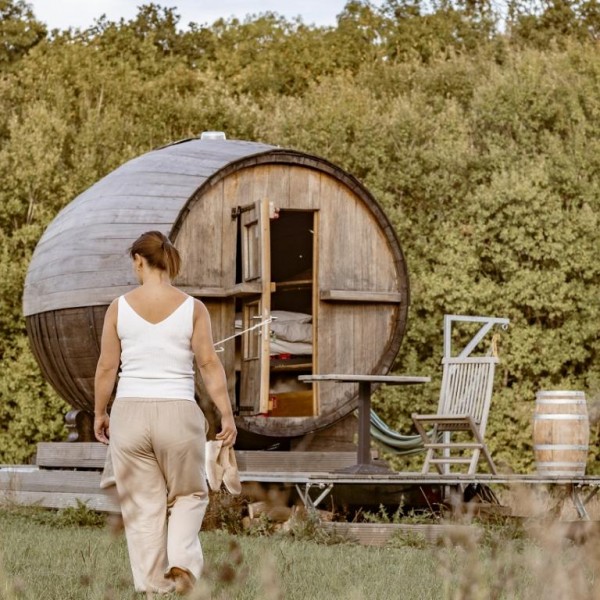 Logeren als God naast Frankrijk in een authentieke eiken wijnvat in volle natuur of in een cederhouten slaappod met ofwel tweepersoonsbed (POD M) ofwel twee enkele bedden (POD XL)