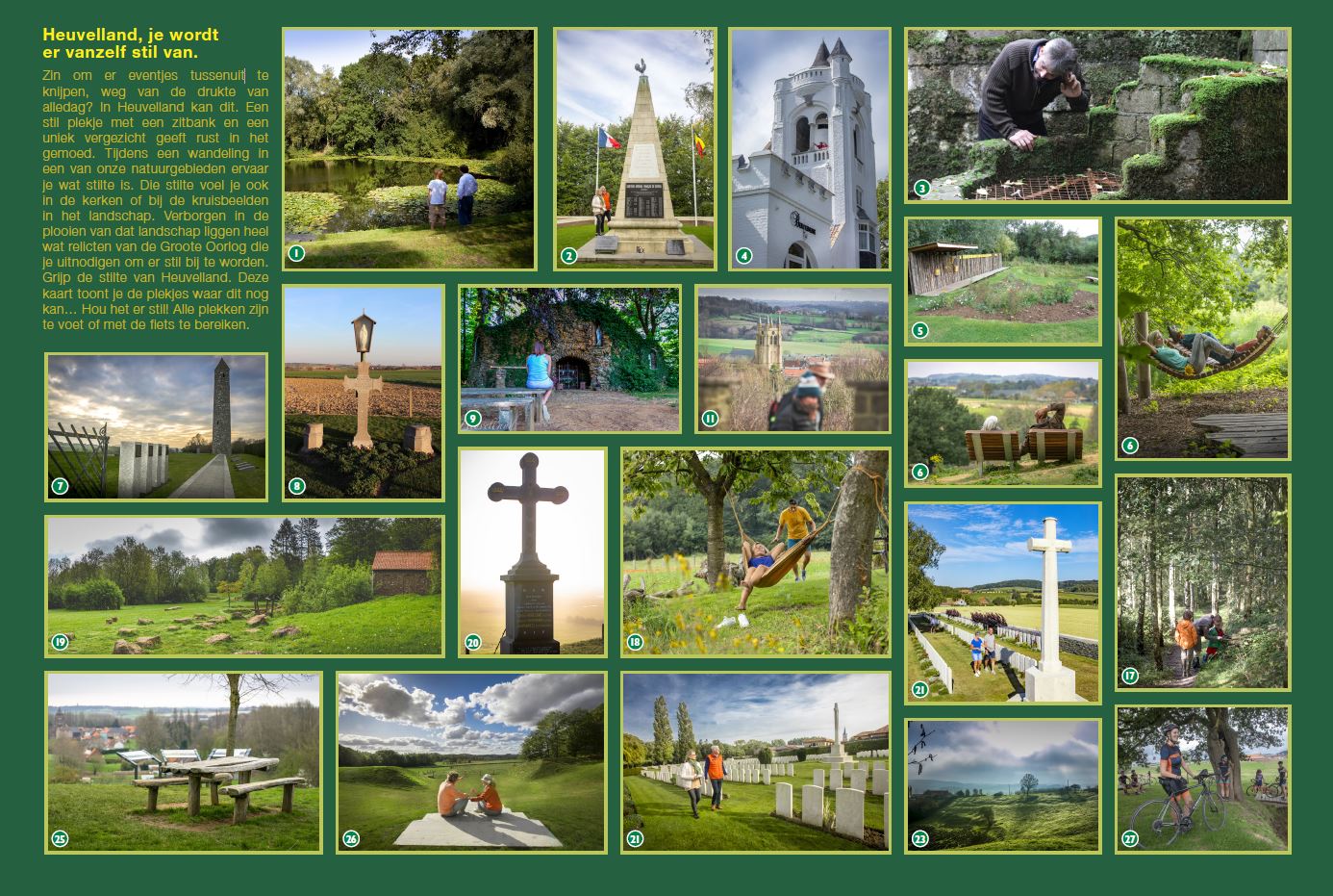 Zin om er eventjes tussenuit te zijn, op zoek naar luwte, weg van de drukte van iedere dag ? In Heuvelland kan dit. Verborgen in de plooien van ons landschap liggen heel wat plekjes die ons uitnodigen om er eventjes te verpozen: een zitbank met een adembenemend vergezicht, een hangmat langs ons stiltepad, een open plekje in het Hellegatbos, een slingerend paadje in natuurgebied het Eeuwenhout, een begraafplaats uit de ‘Groote Oorlog’ En de stilte die voel je ook in één van onze kerken of bij de vele kruisbeelden in het landschap.. Heuvelland, je wordt er vanzelf stil van…