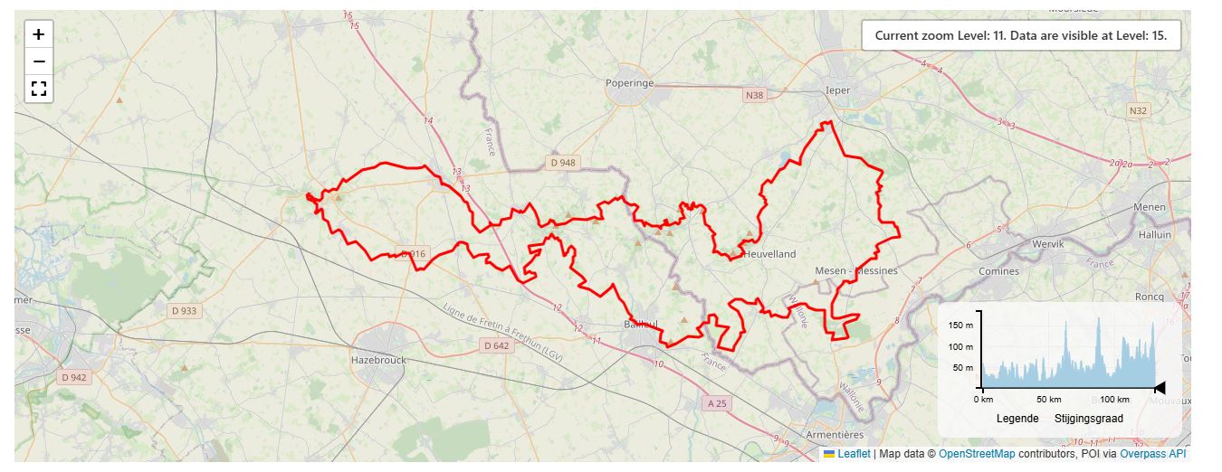 131 km bewegwijzerde wandelpaden op en rond de heuvels van de Westhoek (West-Vlaanderen) vormen de geel-rode draad van deze route.