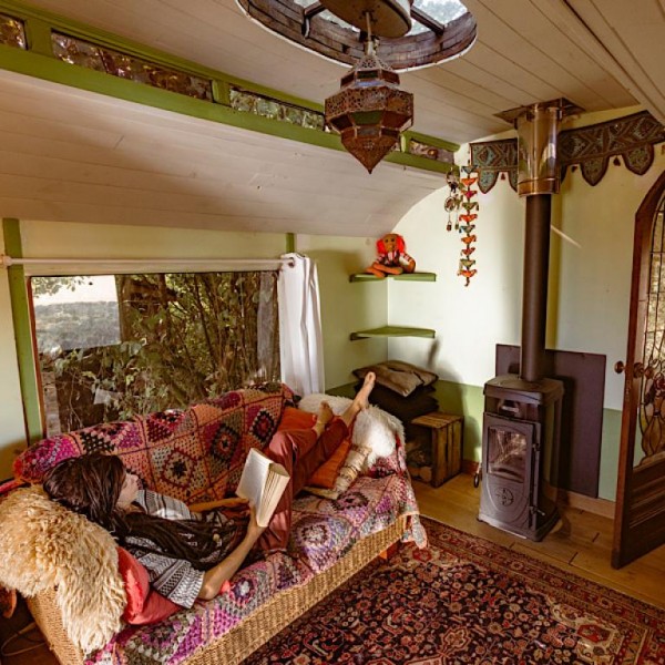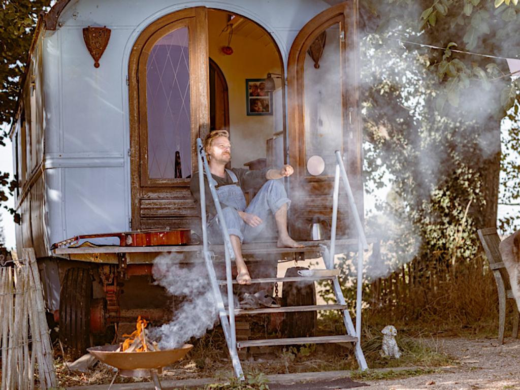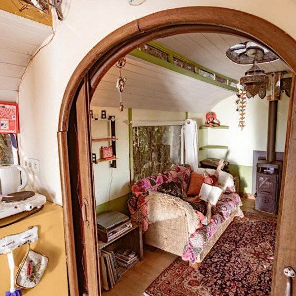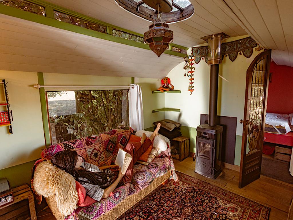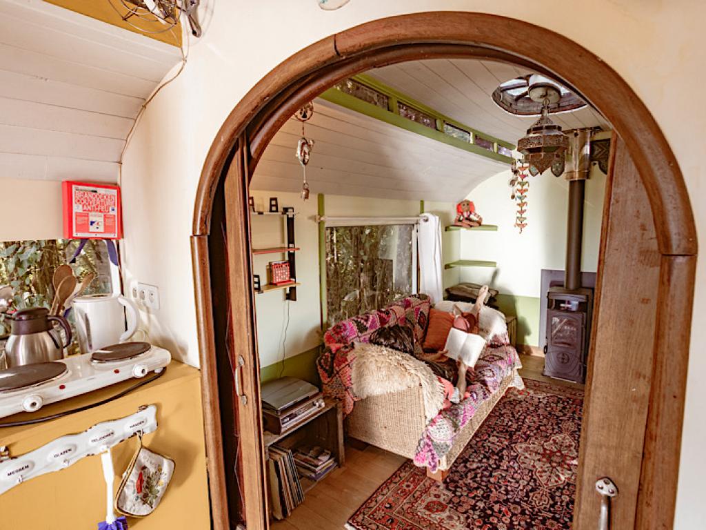 Op een hoekje van het Natuurterrein staat, weg van de andere gasten, ietsje verscholen naast het bosje en onder de grote notelaar, een authentieke woonwagen of ‘roulotte’.