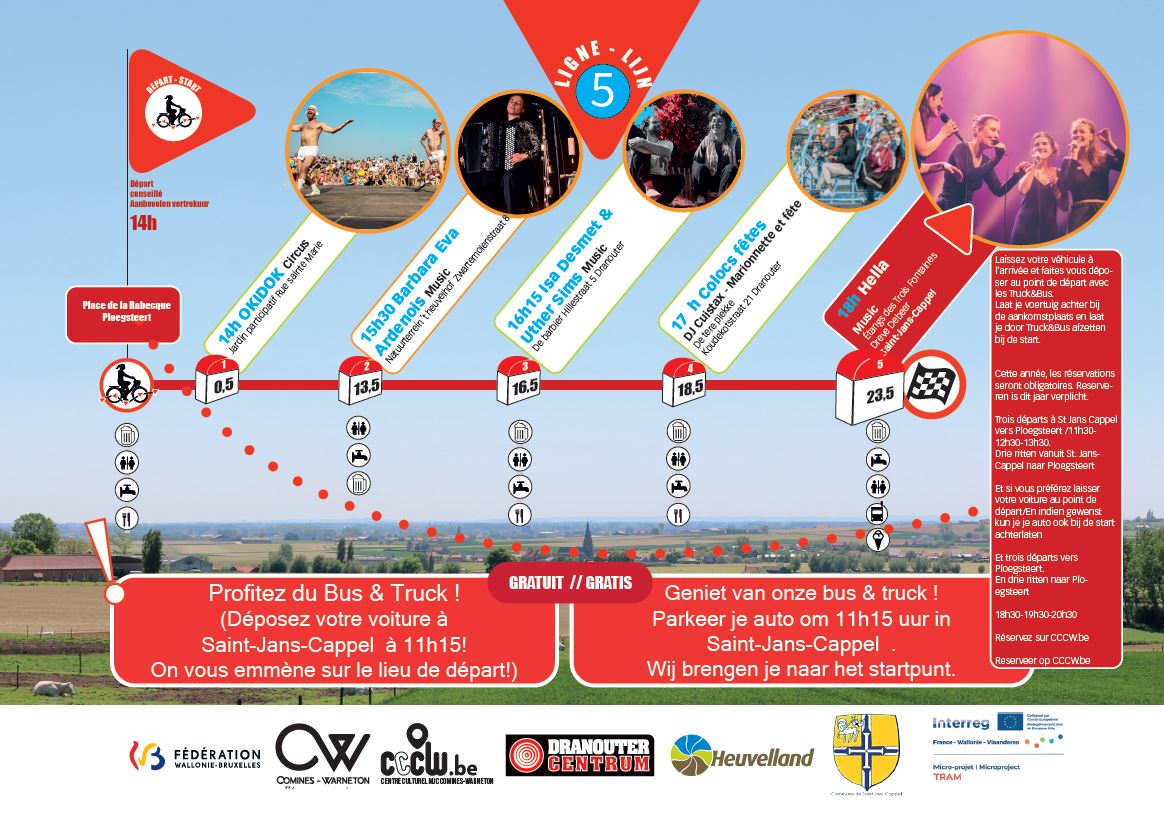 De grand départ van TRAM! vindt dit jaar plaats in Ploegsteert met de straffe straattheateract OKIDOK om 14u00. Langs een mooi en goed bewegwijzerd parkoers nemen we je mee op een kunstavontuurlijke tocht doorheen ons prachtig landschap langs Dranouter richting Sint-janskappel. Op enkele leuke en unieke locaties kun je genieten van straf straattheater, toffe optredens en een snuifje geschiedenis...