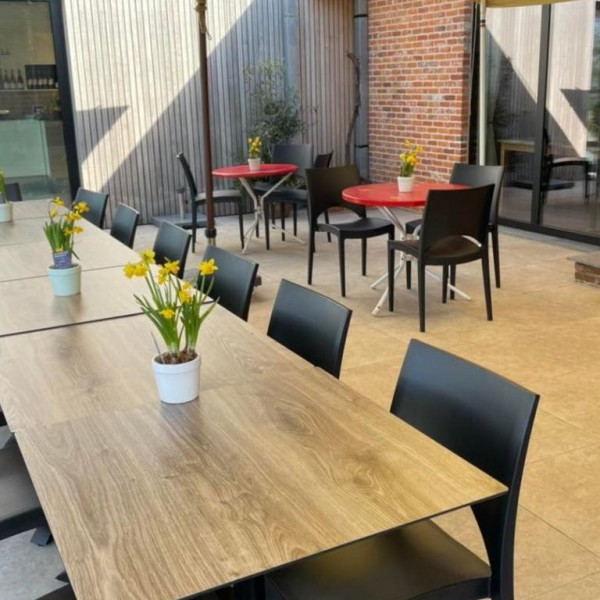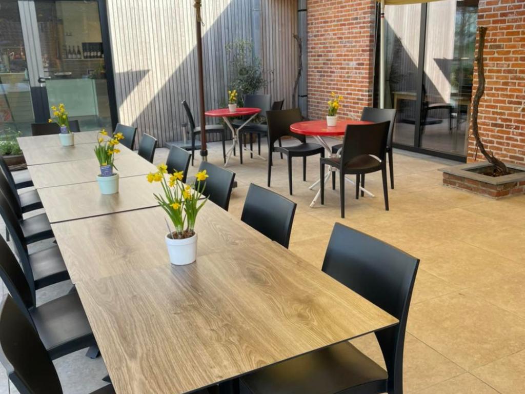 Op het wijnterras word je verwend met een geweldig uitzicht over de zuidgerichte wijngaard en de omliggende velden tot aan de Franse grens. Je waant je in het verre zuiden, zeker met een glaasje heerlijke wijn in de hand. De perfecte rustplaats tijdens een verkenning van het Heuvelland, te voet of met de fiets.